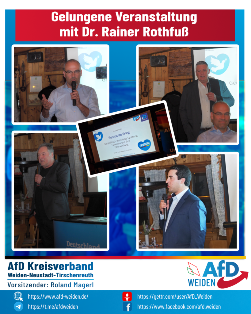 Europa im Krieg Geopolitisch motivierte Spaltung Eurasiens und ihre Überwindung Zu diesem Thema hatte die AfD Weiden den 1. Stellvertretenden Vorsitzenden der AfD Bayern, Dr. Rainer Rothfuß eingeladen, und zwar […]