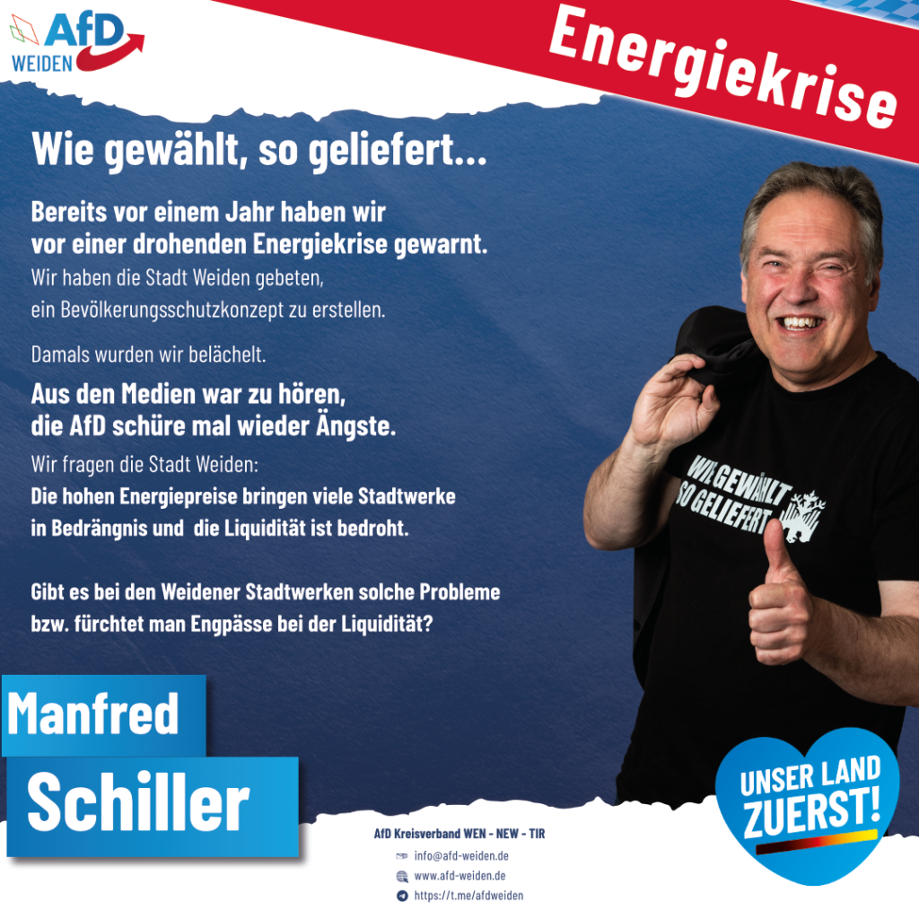 Bereits vor einem Jahr (am 05.10.2021) haben wir vor einer möglichen Energiekrise gewarnt. Wir haben von der Stadt Weiden gefordert, ein Bevölkerungsschutzkonzept zu erstellen. Die Stadt Weiden hat damals schon […]
