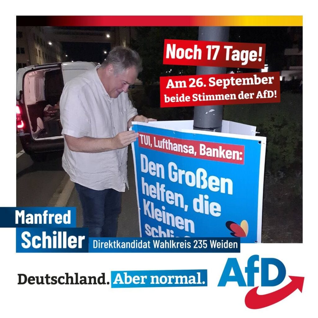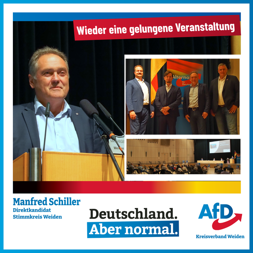 Wieder eine gelungene Veranstaltung. Am 02.09.21 lud der AfD Kreisverband Weiden zur Kundgebung in die Max-Reger-Halle. Hier stellte sich unser Direktkandidat Manfred Schiller den etwa 42 Teilnehmern der Veranstaltung vor. […]