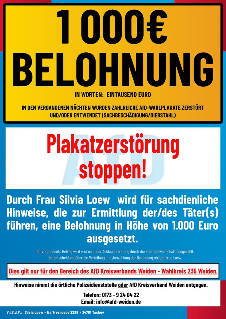 ⚠️ 1.000€ Belohnung ⚠️ In Worten: Eintausend Euro IN DEN VERGANGENEN NÄCHTEN WURDEN ZAHLREICHE AfD-WAHLPLAKATE ZERSTÖRT UND/ODER ENTWENDET (SACHBESCHÄDIGUNG/DIEBSTAHL) ❗️Plakatzerstörung stoppen ❗️ Durch Frau Silvia Loew wird für sachdienliche Hinweise, […]