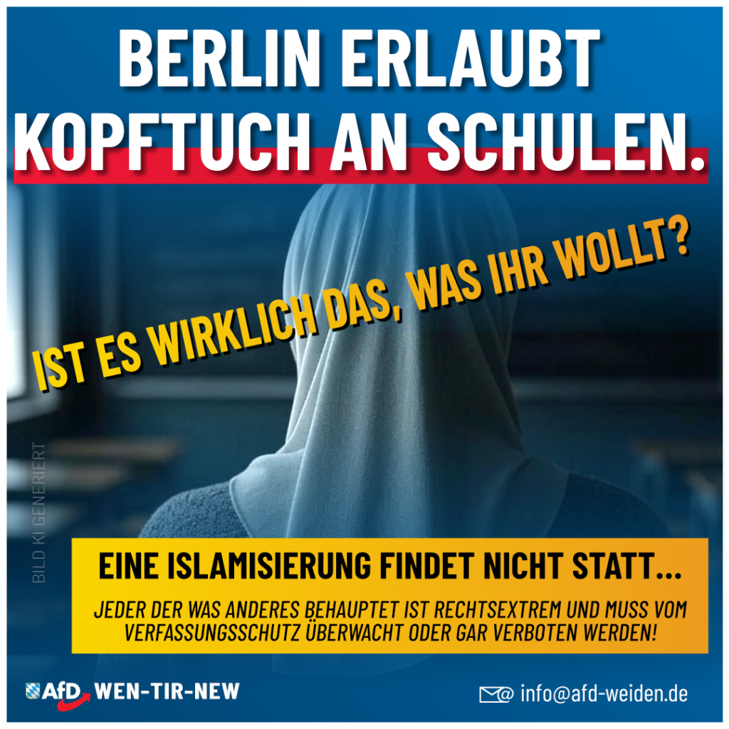 Jetzt soll das islamische Kopftuch an Berliner Schulen offiziell erlaubt werden – angeblich „nur, wenn der Schulfrieden nicht gestört wird“. Ein klarer Bruch mit der staatlichen Neutralität! 👉 Lehrerinnen mit […]