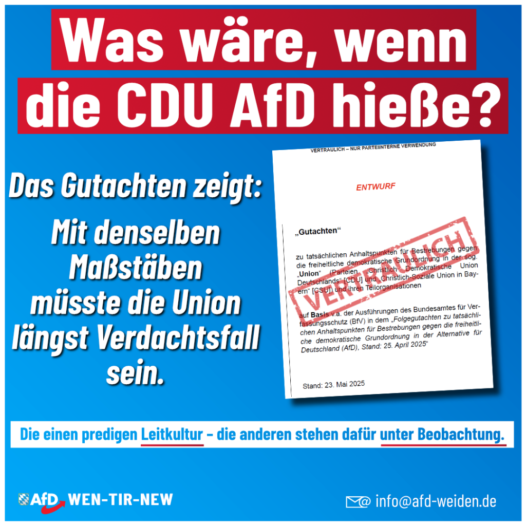 🛑 Doppelmoral entlarvt: Verfassungsschutz als politisches Kampfmittel? Das Gutachten zeigt auf: Wendet man die Maßstäbe des Verfassungsschutzes, wie sie gegen die AfD angewendet werden, auf CDU und CSU an – […]