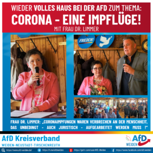 Frau Dr. Limmer, die auch im Corona-Ausschuss des Europaparlamentes ist, gab einen Einblick in ihre Arbeit in diesem Ausschuss. Sie berichtete z. B. darüber, dass Impfstoffe, wenn ihre Wirksamkeit und Sicherheit verantwortungsbewusst getestet werden, bis zur endgültigen ordentlichen Zulassung 10 bis 15 Jahre benötigen. Im Falle von Corona dauerte dieses Verfahren neun M o n a t e ! Auf EU-Ebene war demnach an Sicherheit niemand interessiert.