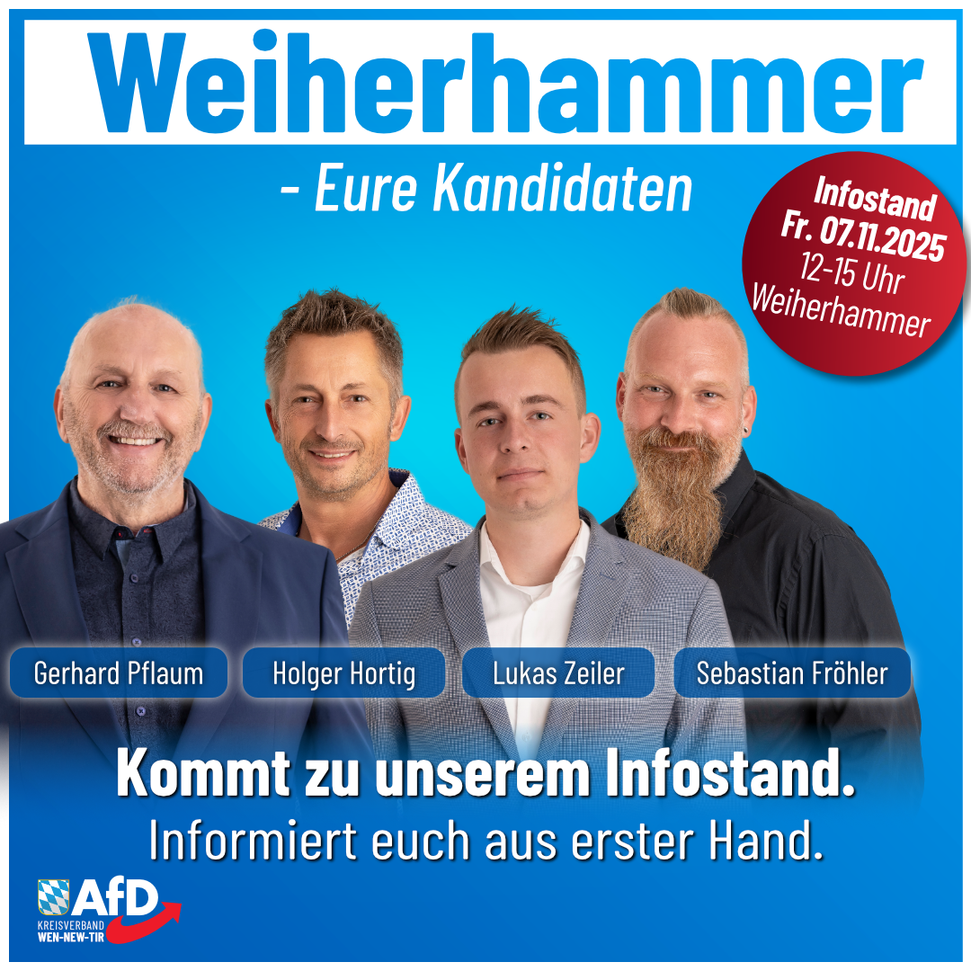 Am Freitag, den 07. November 2025, stehen wir von 12 bis 15 Uhr beim AfD-Infostand in Weiherhammer.