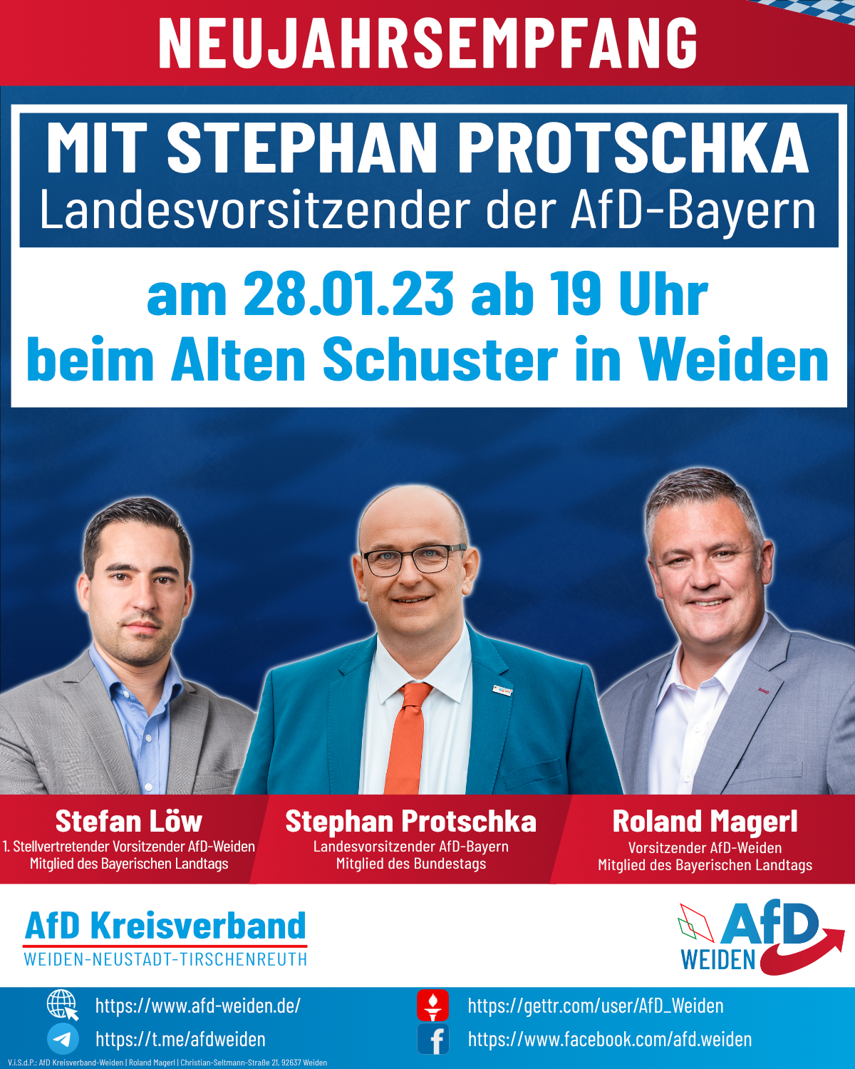 Der Kreisverband Weiden-Neustadt-Tirschenreuth der Alternative für Deutschland lädt für den 28.01.2023 um 19 Uhr seine Mitglieder und Interessenten in das Schmankerlwirtshaus